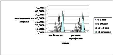 В зависимости от стажа получены следующие результаты: отклонения от нормы выявлены у трех групп 6-10 лет (у 4,1% лиц),11-15 (у 20% обследованных),у более 16 лет (21,8%) (таб. 3).