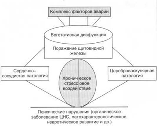 Суть приводимой модели состоит в формировании на ранних этапах катастрофы патологических изменений. При этом глубина изменений зависит как от выраженности факторов аварии, так и от преморбидных соматических и личностных черт. Патологическая почва в первую очередь характеризуется нарушением центральной вегетативной, эндокринной, сердечно-сосудистой регуляции и проявляется различными психопатологическими синдромами: вегетативным, астеническим, алгическим, неврастеническим и др. Актуальные стрессоры поставарийного периода воздействуют на патологически измененную почву и способствуют развитию синдромов экзогенно-органического полюса, патологических развитий личности и других хронических состояний, распространенность которых может достигать степени психической эпидемии. Приведенные выше особенности экологических катастроф и психических нарушений, возникающих после них, подтверждают необходимость создания специализированной медико-психологической и психиатрической службы, способной оказывать адекватную помощь пострадавшим на постоянной основе.
