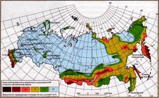 Что же делать? Учиться на ошибках можно до бесконечности. И в 1991 г. российские сейсмологи взялись за решение проблемы иначе. Раньше на карте отмечали зоны максимально возможной балльности и указывали, как часто подобные события могут здесь повторяться (с периодичностью от 100 до нескольких тысяч лет). А теперь решили сделать карту, которая отвечала бы на вопрос: какова вероятность того, что в данной зоне балльности в ближайшие 50 лет случится более сильное землетрясение?