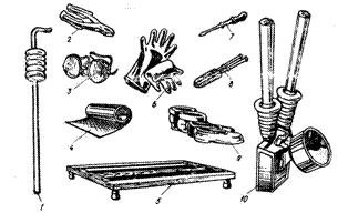 1 - выключающая штанга; 2 - пасатижы; 3 - защитные очки; 4 - изолирующий коврик; 5 - изолирующая подставка; 6 - изолирующие перчатки; 7 - отвертка; 8 - клещи; 9 - технические галоши и клещи; 10 - токоизмерительные клещи.