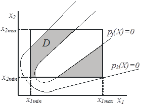 При решении многокритериальных задач обычно задаются параметрические ограничения вида xi min ≤ xi ≤ xi mах, при i=1, 2, …, n, которые формируют в пространстве параметров n-мерный параллелепипед (рис. 4, а). Далее предполагается, что заданы функциональные ограничения вида pj (x) ≤ 0, при j=1, 2, …, m, которые вырезают в параллелепипеде некоторую часть D, состоящую из точек Х, удовлетворяющих одновременно параметрическим и функциональным ограничениям. В лекции 5 эту часть пространства мы называли допустимой областью (ДО). Множество D может оказаться весьма сложным, например, состоящим из нескольких отдельных частей (рис. 6, б, закрашенные участки).