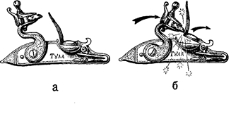 Рис. 2. Искровой ударный кремневый замок а — со взведенным курком; б — в момент удара курка по огниву.