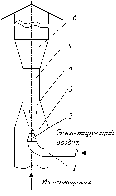 Принцип действия эжектора следующий (рис.14). Воздух, нагнетаемый расположенным вне помещения компрессором, подводится по трубе 1 (рис. ) к соплу 2 и, выходя из него с большой скоростью, создает за счет эжекции разрежение в камере 3, куда подсасывается воздух из помещения. В конфузоре 4 и горловине 5 происходит перемешивание эжектируемого (из помещения) и эжектирующего воздуха. Диффузор 6 служит для преобразования динамического давления в статическое. Недостатком эжектора является низкий к.п.д, не превышающий 0,25.