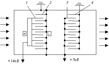 Для очистки приточного воздуха от пыли и тумана применяют электрофильтры. Работа электрофильтров основана на создании сильного электрического поля при помощи выпрямленного тока высокого напряжения (до 35 кВ), подводимого к коронирующим и осадительным электродам. При прохождении запыленного воздуха через зазор между электродами происходит ионизация молекул воздуха с образованием положительных и отрицательных ионов. Ионы, адсорбируясь на частицах пыли, заряжают их положительно или отрицательно. Пыль, получившая заряд отрицательного знака, стремится осесть на положительном электроде, а положительно заряженная пыль оседает на отрицательных электродах. Эти электроды периодически встряхиваются с помощью специального механизма, пыль собирается в бункере и периодически удаляется (рис.17).