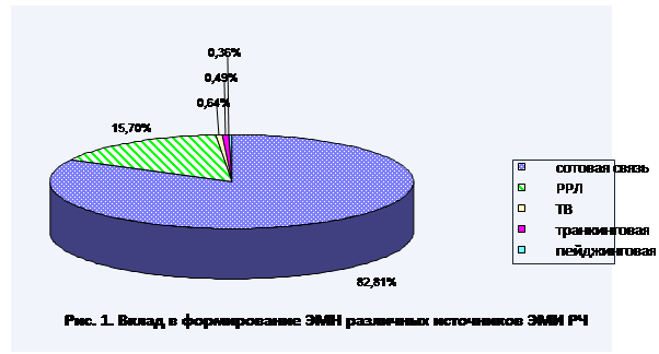 Проведенные исследования ЭМП радиочастотного диапазона (30 кГц – 300 ГГц) г. Красноярска показали, что наибольший вклад в формирование ЭМН селитебных зон города – 82,81% – вносит сотовая связь.
