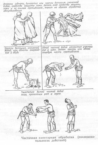 Частичная санитарная обработка личного состава заключается в удалении радиоактивных веществ, обезвреживании или удалении отравляющих веществ и бактериальных (биологических) средств с открытых участков кожных покровов, а также с надетых средств индивидуальной защиты, обмундирования, снаряжения и обуви.